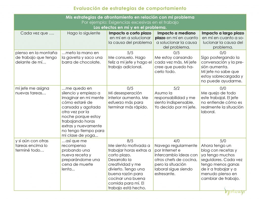 La tabla suele ser suficiente para dejar claro a la persona afectada cuáles son los próximos pasos y qué nuevas estrategias de comportamiento le gustaría desarrollar en relación con su tema.